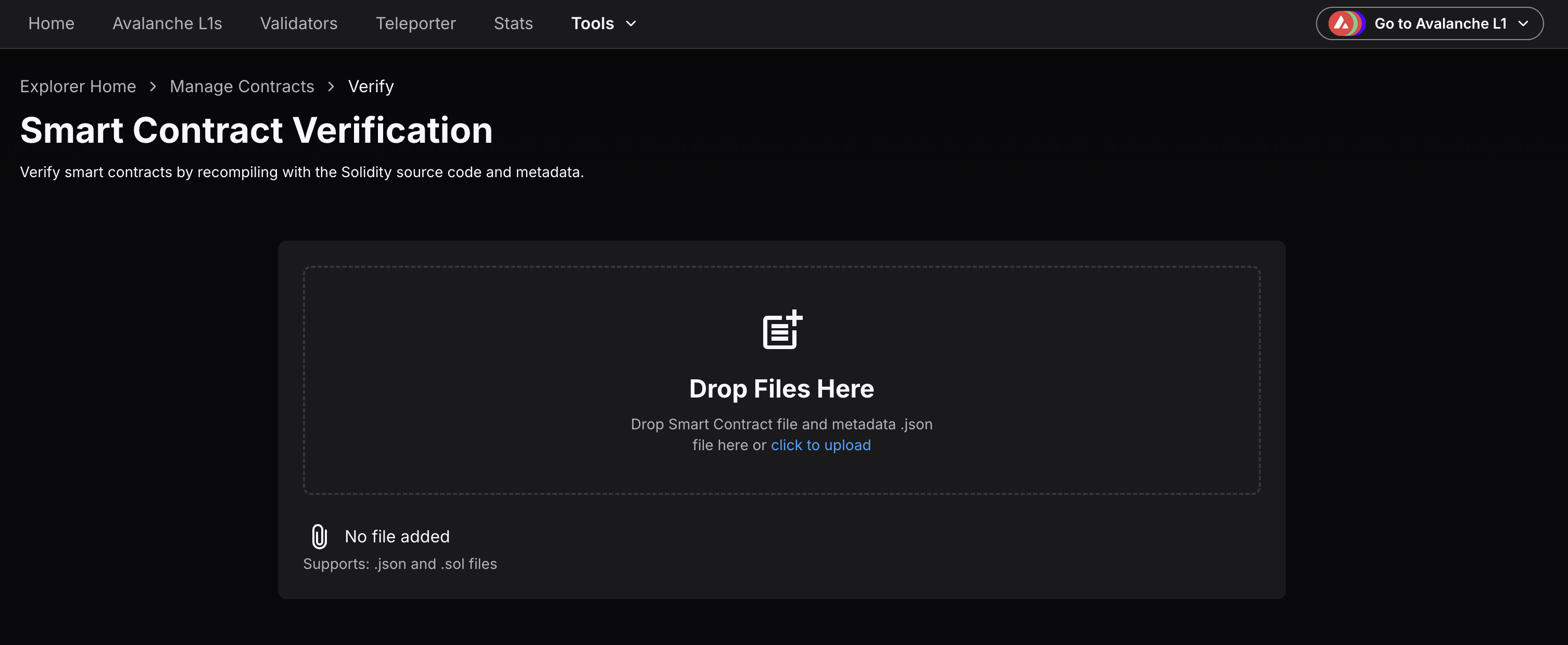 - Navigate to the official Avalanche Explorer and click on Tools dropdown menu to select Smart Contract Verification interface. You may need to open the Testnet Explorer in case the contract is deployed on Fuji Testnet.